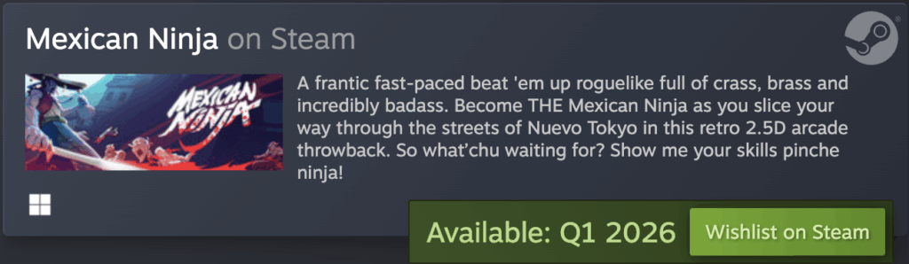 Añade un poco de estilo a tus golpes. Amber acaba de lanzar la primera demo de Mexican Ninja. Un juego de lucha roguelike en 2,5D rápido, descarado y gloriosamente exagerado. Los jugadores se abrirán camino a través de Nuevo Tokio, una caótica colisión entre el espíritu mexicano y el cyberpunk japonés, donde los narcos y los yakuza se han fusionado para formar los corruptos narkuzas.