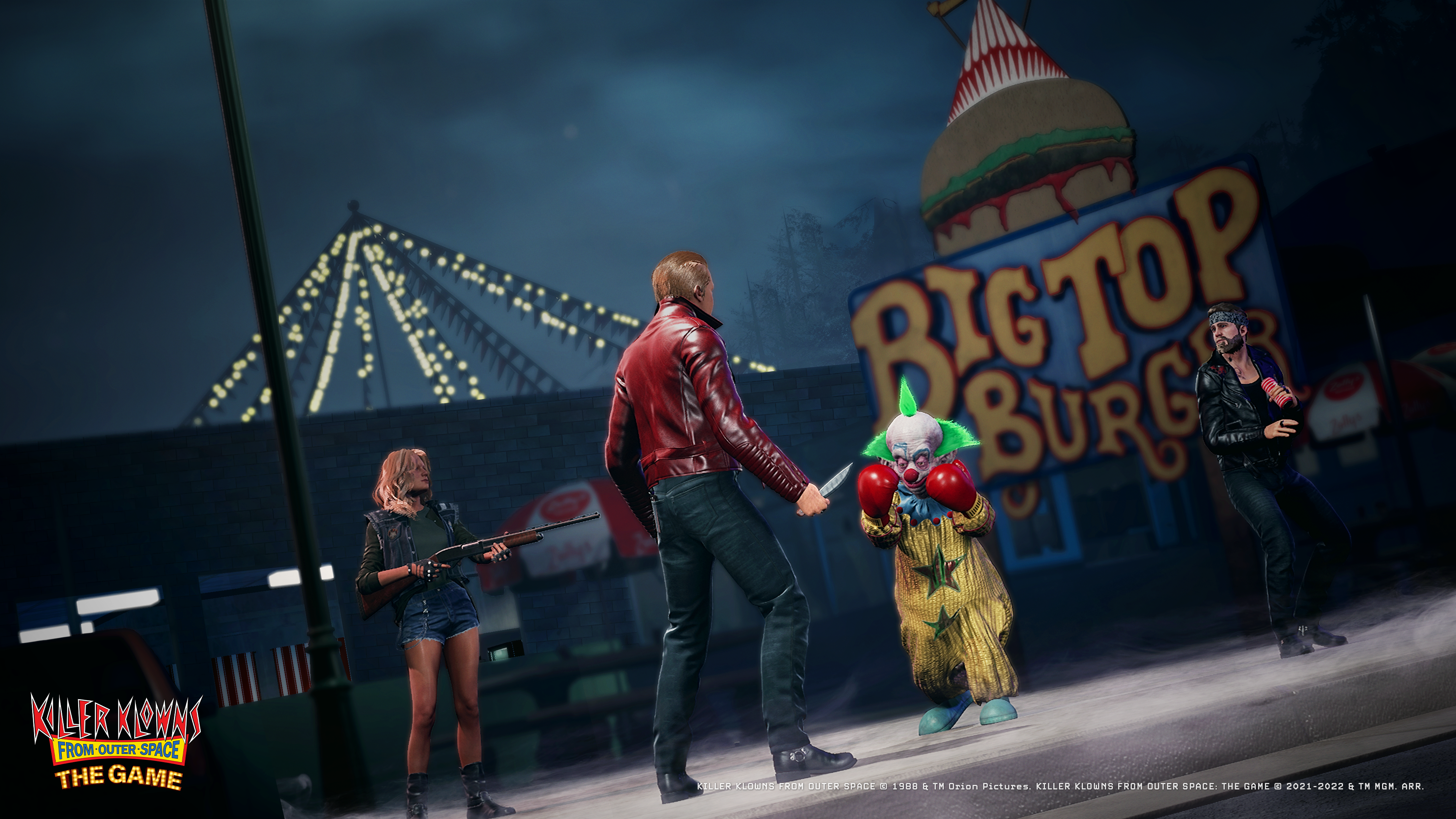 En Killer Klowns from Outer Space: The Game podrás asumir el papel de los icónicos Killer Klowns cooperando en un equipo de tres jugadores, repleto de habilidades extravagantes que te ayudarán a cazar humanos con armas estrafalarias y planificar tu propia invasión alienígena para cosechar a la población de Crescent Cove. O puedes unir tus fuerzas a otros humanos como parte de un equipo de siete valientes ciudadanos de Crescent Cove, elegir tu clase, explorar la ciudad en busca de valiosos botines y armas, evitar que los payasos te capturen e intentar sobrevivir, o sabotear la invasión alienígena.