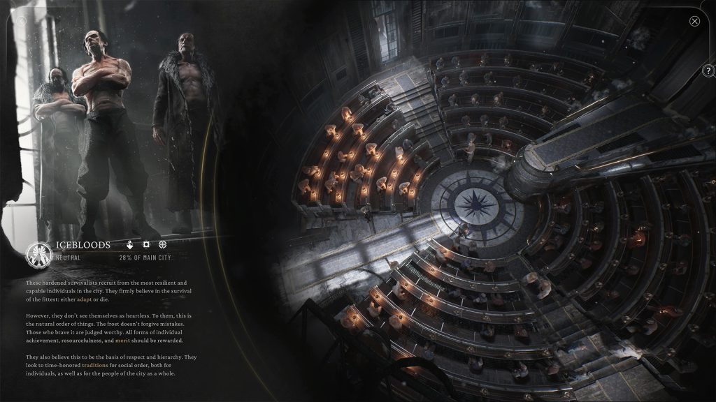 Frostpunk 2 introduce a las facciones, a menudo con intereses extremadamente conflictivos, que provocarán turbulencias políticas que el jugador deberá mediar. Los jugadores pueden optar por apoyar u oponerse a sus causas, moldeando no solo la economía y la arquitectura, sino también la dirección intelectual de su ciudad.
